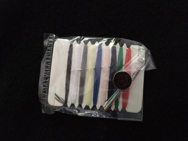 The best kind are the flat, mini sewing kits which you sometimes get at high-end hotels or are occasionally given out as freebies at fairs and conventions. Just a single needle and a few strands of different colored thread will do the job.